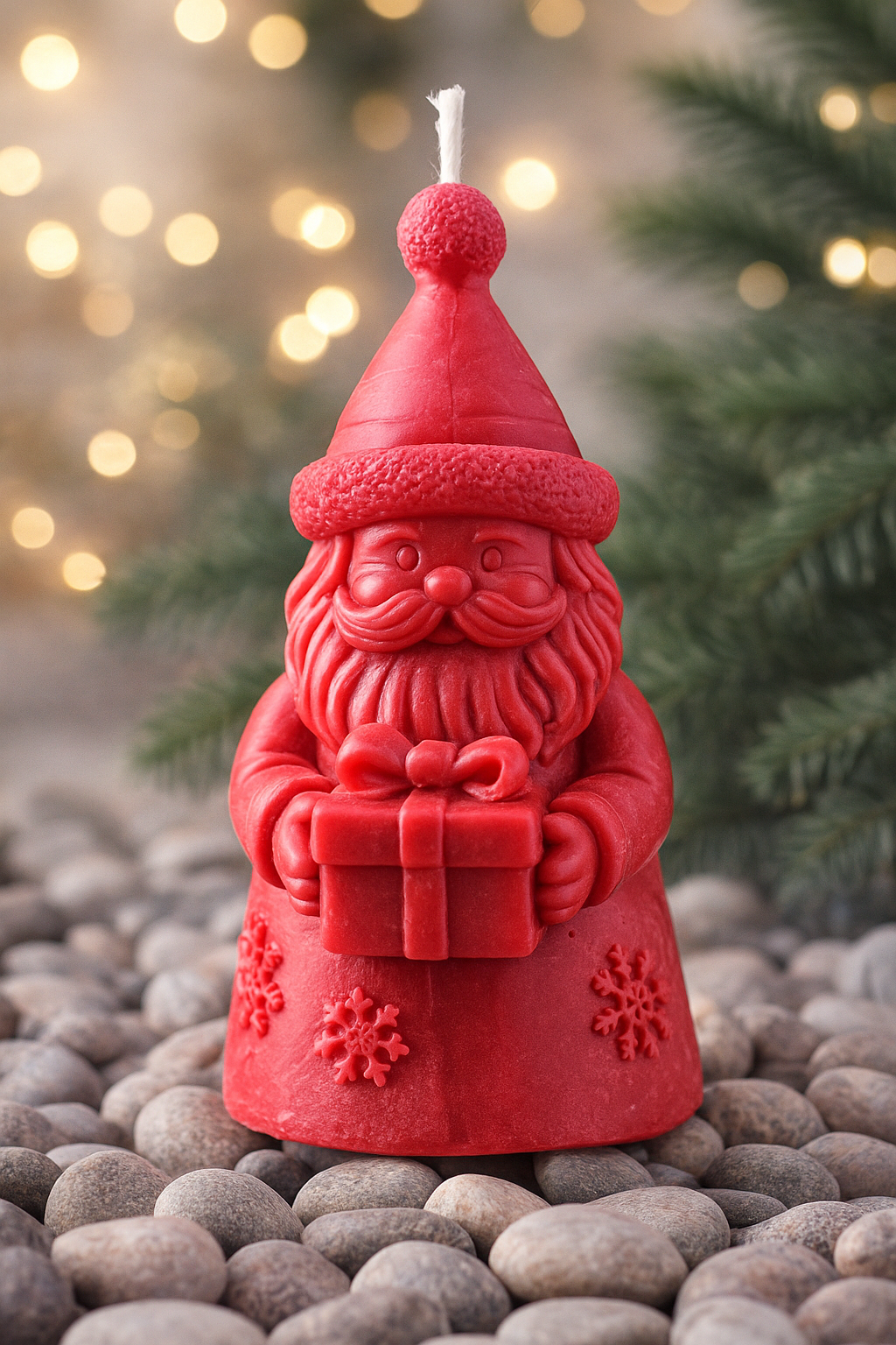 Nuestra Vela Santa Claus Roja está elaborada artesanalmente en cera de soja, con un diseño detallado que muestra a Papá Noel sosteniendo un regalo. Su estilo navideño, cálido y encantador la convierte en el complemento perfecto para decorar mesas, estanterías o armar rincones festivos.